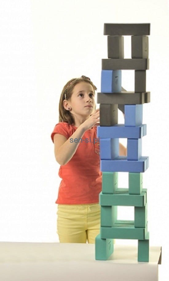 Kształty klocków pobudzają wyobraźnię na różne sposoby. Brak instrukcji, wskazówek i sugestii pozostawia dziecku dowolność w zabawie