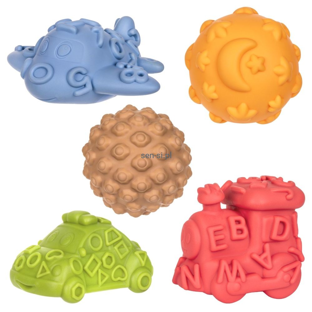 Każdy kształt jest inny i w innym kolorze. Dodatkowo każdy element zestawu to zróżnicowane faktury, które sprawdzą się fenomenalnie w rozwijaniu zmysłu dotyku i w zabawie.